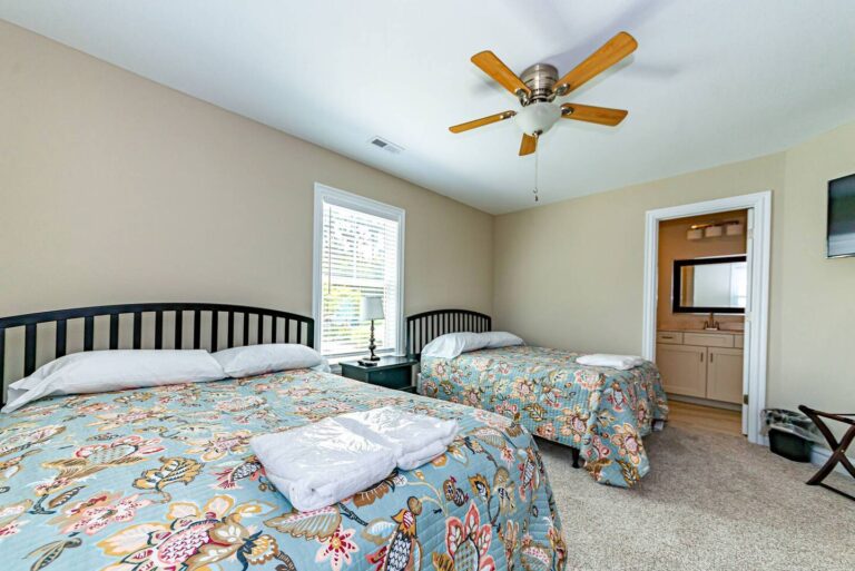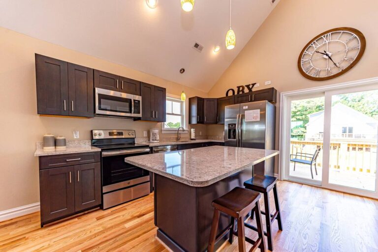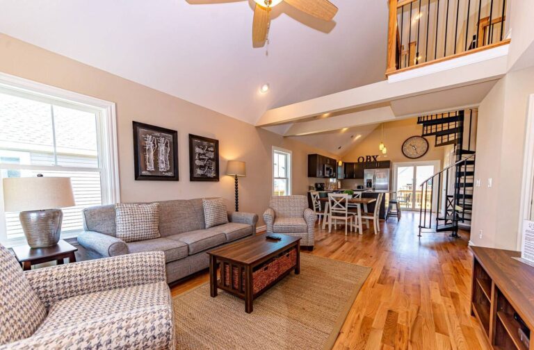 Each of our cottages has two-bedrooms and two-baths on the first level with an open loft accessed by spiral stairs on the second level for a total of 6 full-sized beds per cottage. Our modern floor plans feature a full kitchen, living room and back deck, complete with gas grill – providing the perfect place to relax and enjoy the view of the courtyard putting green.