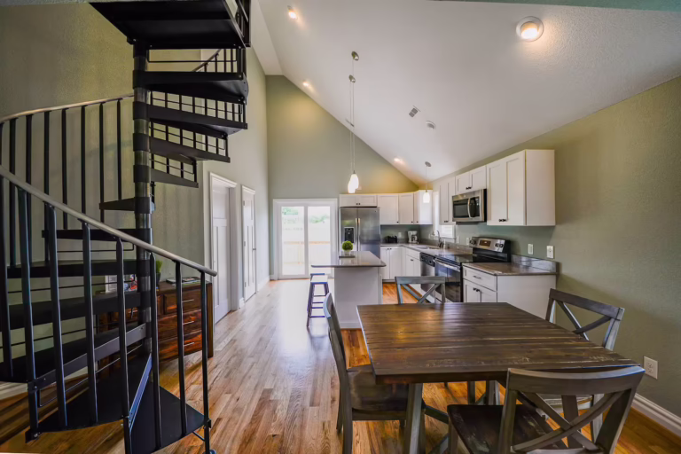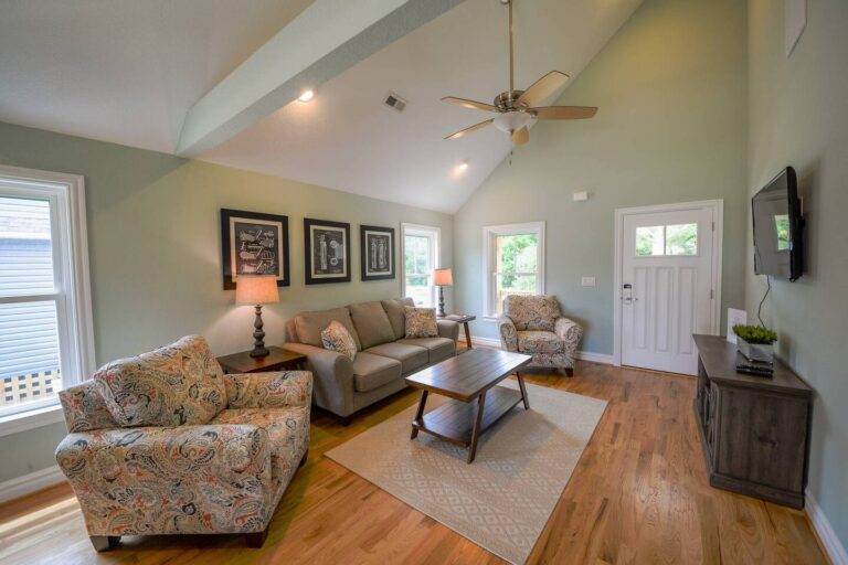 Each of our cottages has two-bedrooms and two-baths on the first level with an open loft accessed by spiral stairs on the second level for a total of 6 full-sized beds per cottage. Our modern floor plans feature a full kitchen, living room and back deck, complete with gas grill – providing the perfect place to relax and enjoy the view of the courtyard putting green.