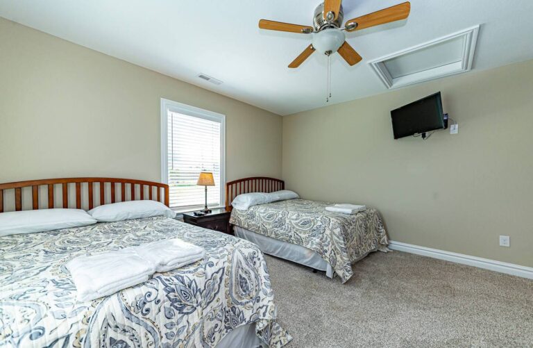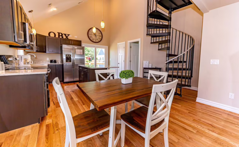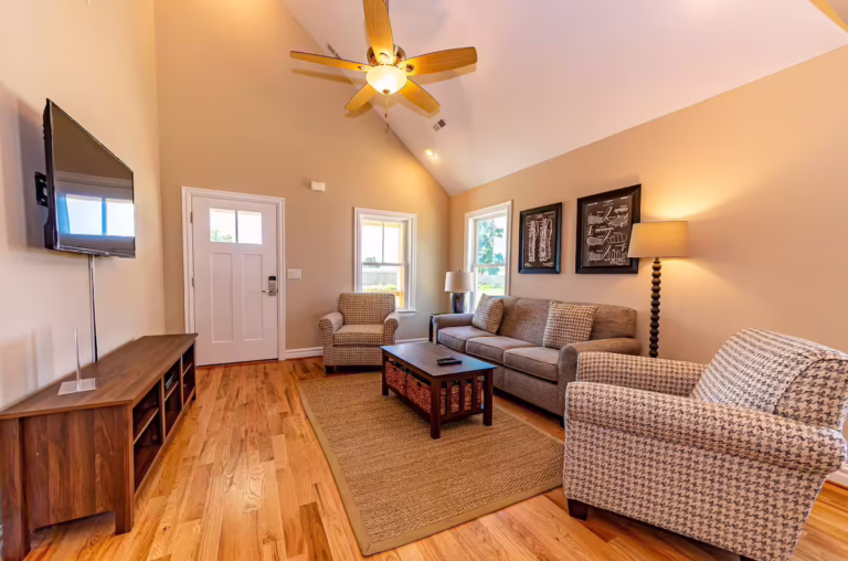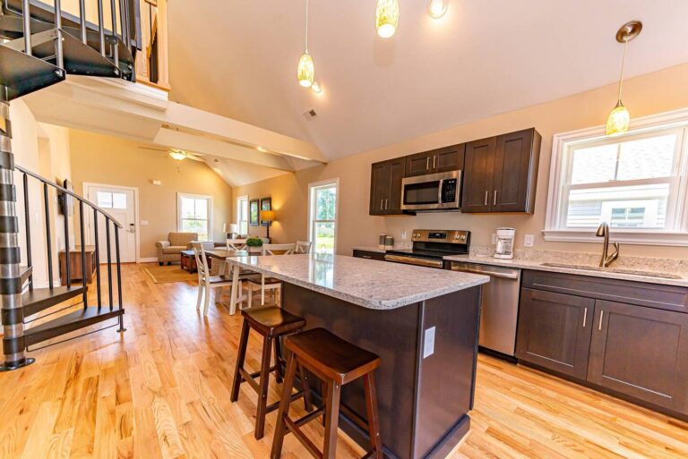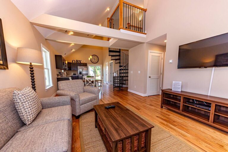 Each of our cottages has two-bedrooms and two-baths on the first level with an open loft accessed by spiral stairs on the second level for a total of 6 full-sized beds per cottage. Our modern floor plans feature a full kitchen, living room and back deck, complete with gas grill – providing the perfect place to relax and enjoy the view of the courtyard putting green.