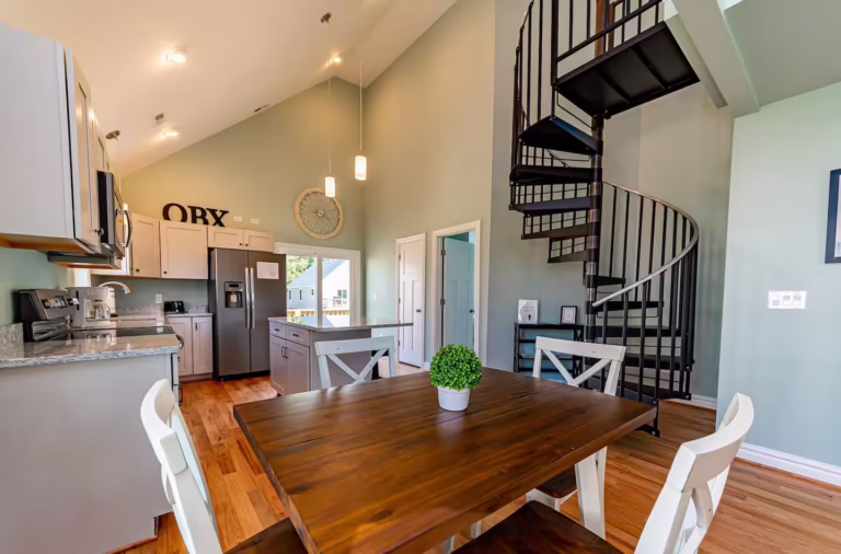 Each of our cottages has two-bedrooms and two-baths on the first level with an open loft accessed by spiral stairs on the second level for a total of 6 full-sized beds per cottage. Our modern floor plans feature a full kitchen, living room and back deck, complete with gas grill – providing the perfect place to relax and enjoy the view of the courtyard putting green.